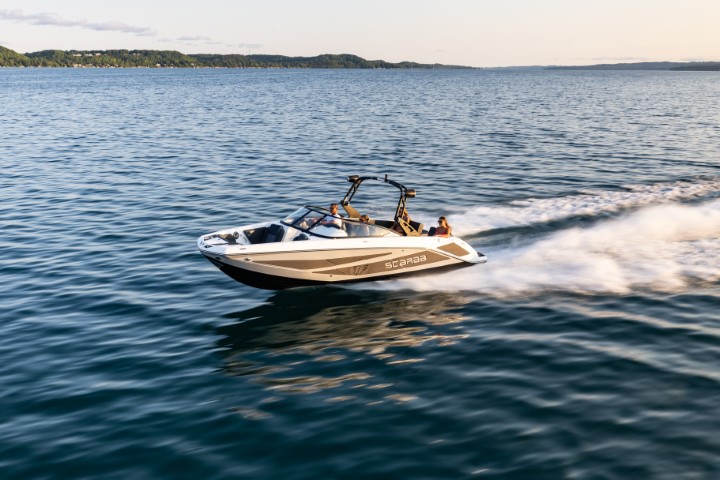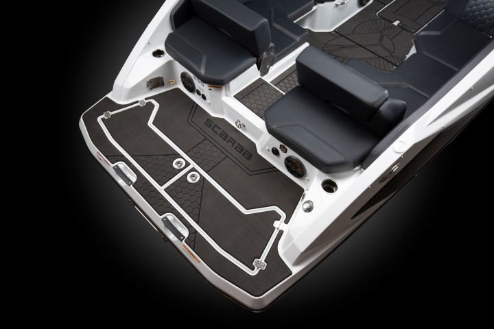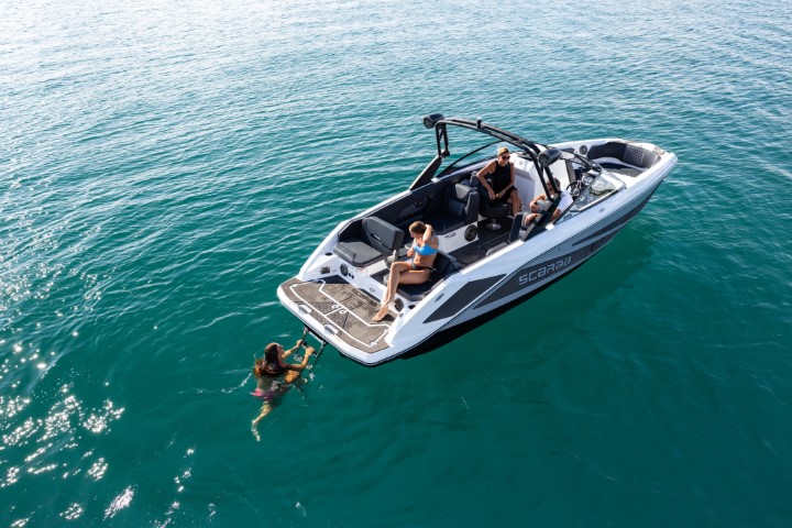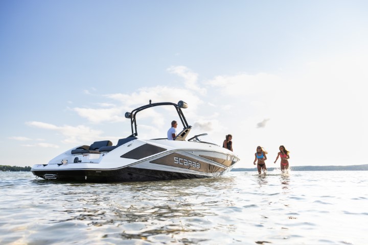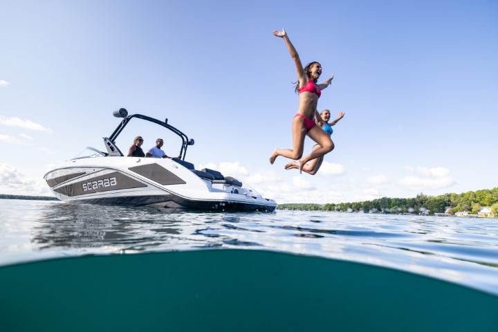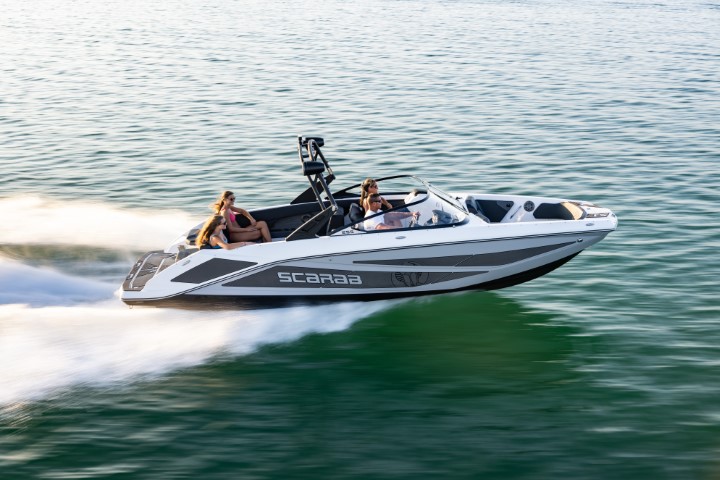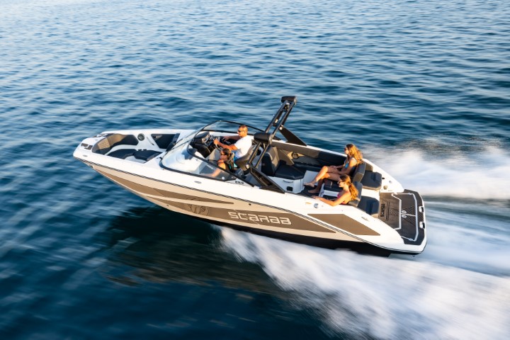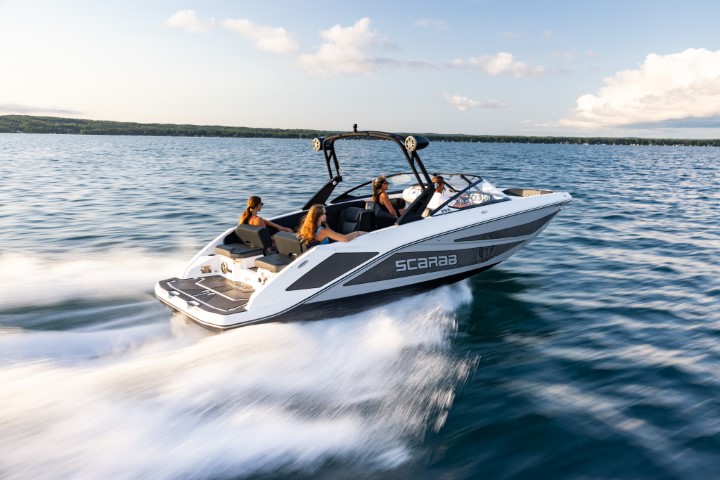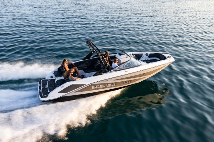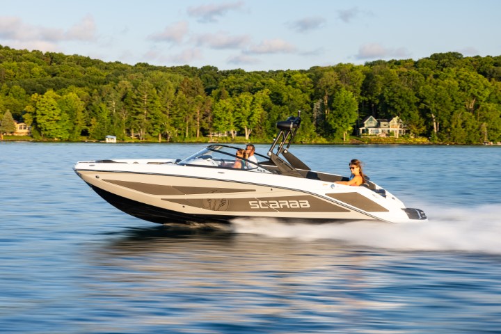 Scarab 255-водометный двухмоторный 25-футовый катер. Боурайдер с расширенным носом. Спортивный буксировщик.