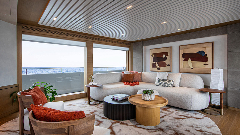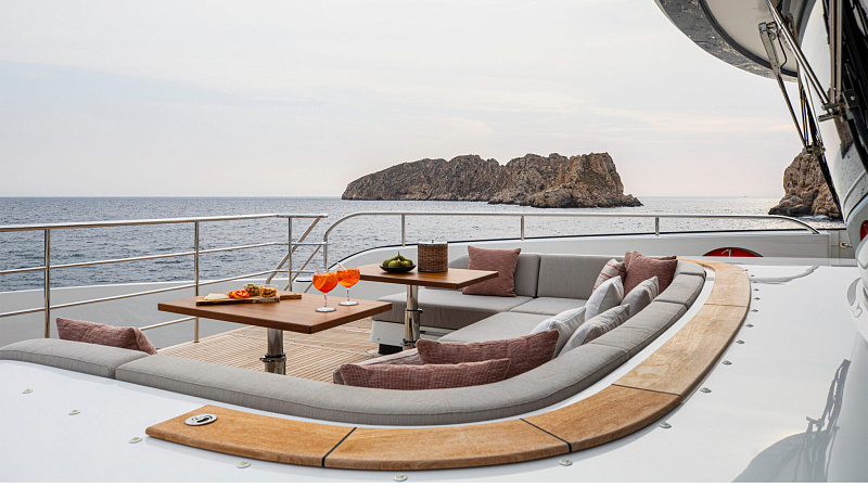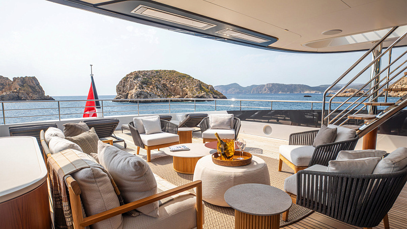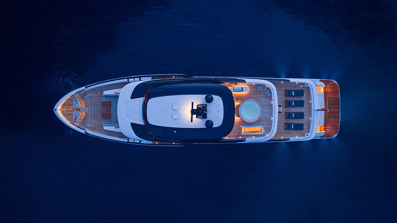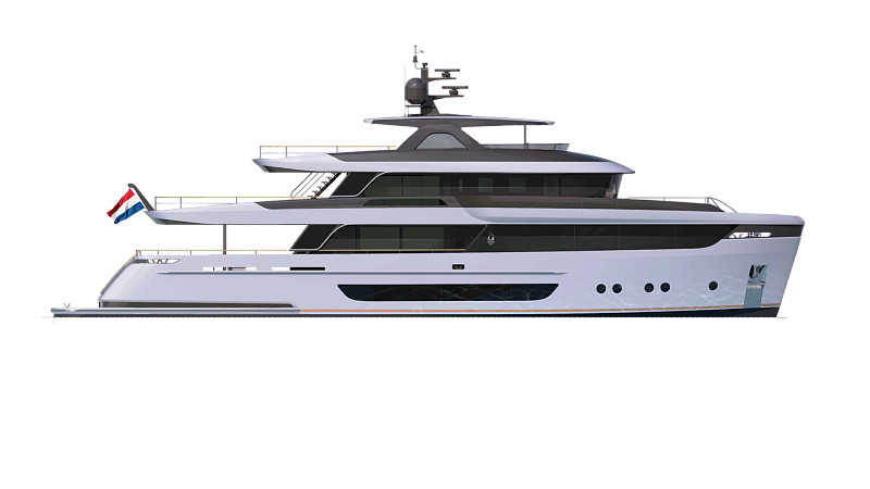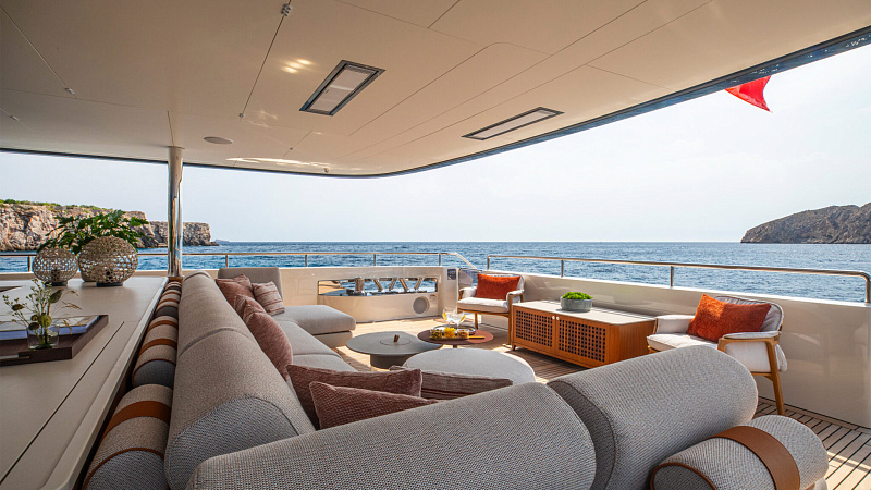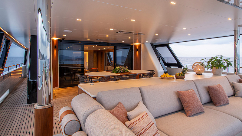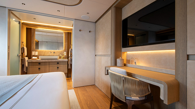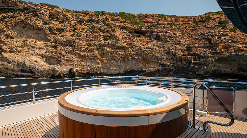 Все, начиная с ватерлинии, на этой восхитительной полностью алюминиевой трехпалубной суперяхте было спроектировано по индивидуальному заказу Гвидо де Грутом. Большое внимание уделено зонам отдыха на открытом воздухе, в том числе большой платформе для купания, которая гармонично вписывается в элегантный образ яхты. Безопасность на этой семейной яхте, рассчитанной на несколько поколений, находится на первом месте: высокие фальшборты на боковых палубах и продуманное цветовое разделение вместо открытых перил. Ритмичные линии, сложные поверхности и скульптурные элементы радуют глаз так же, как и образ жизни на борту