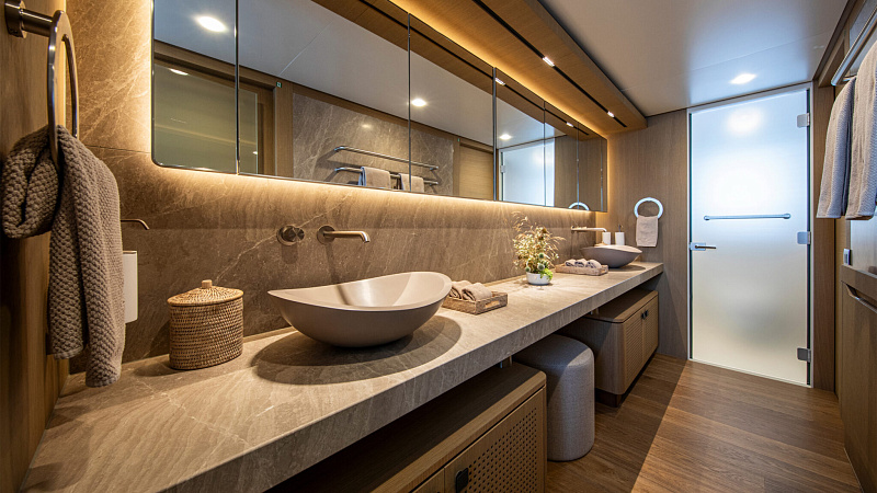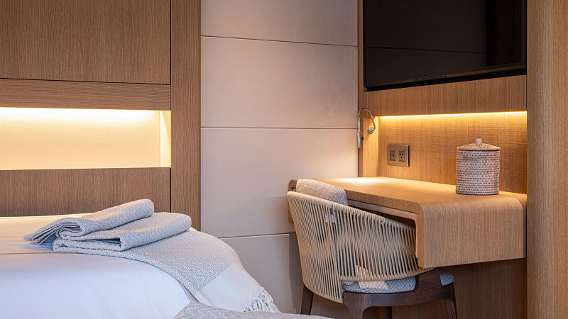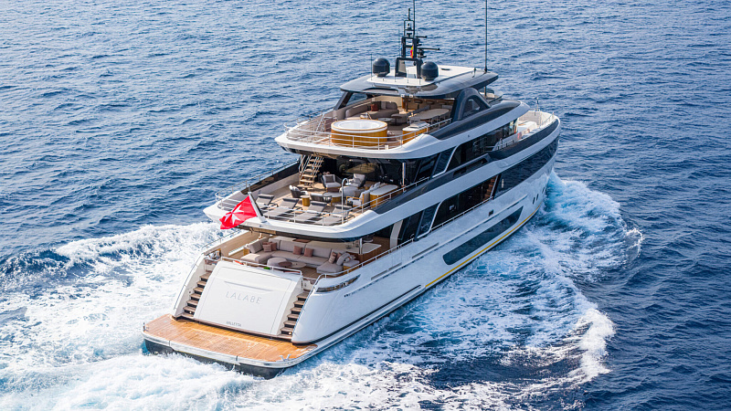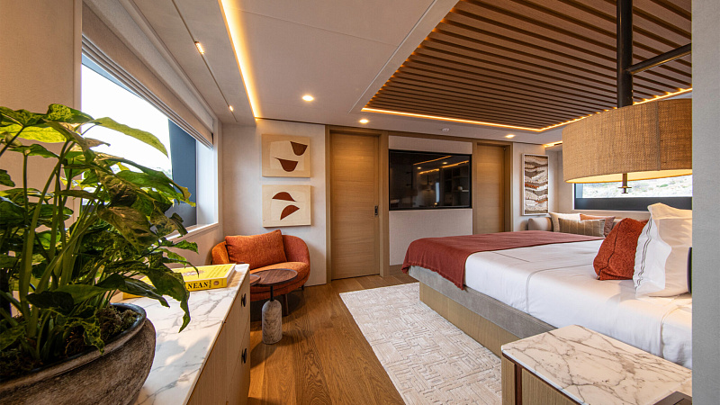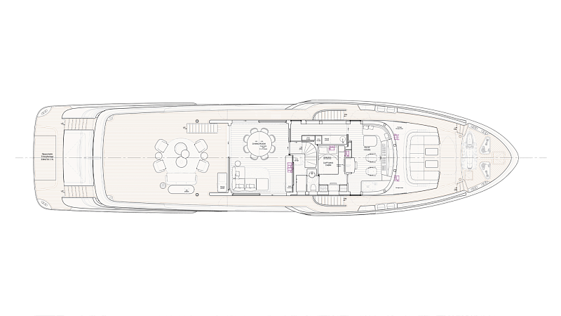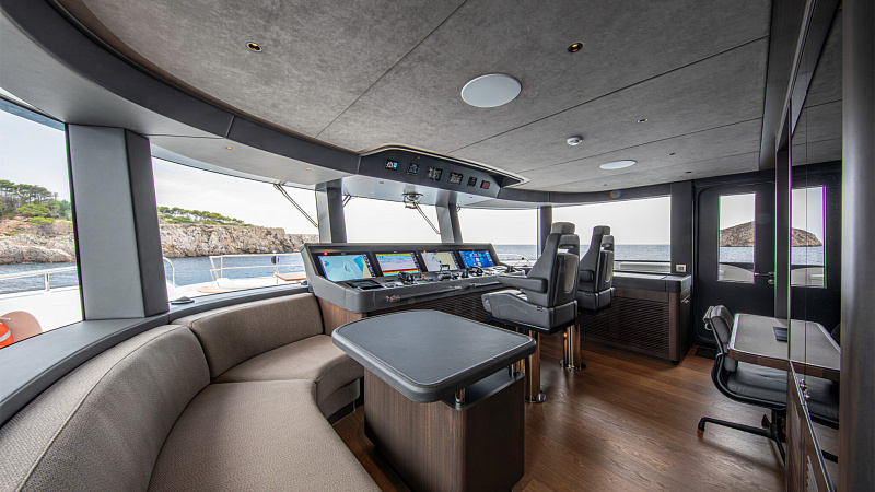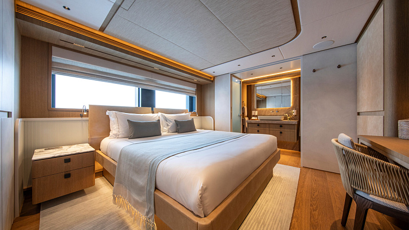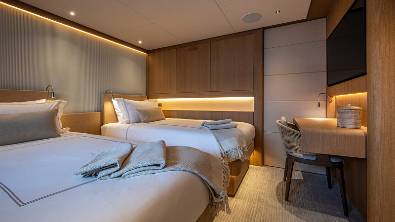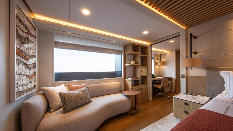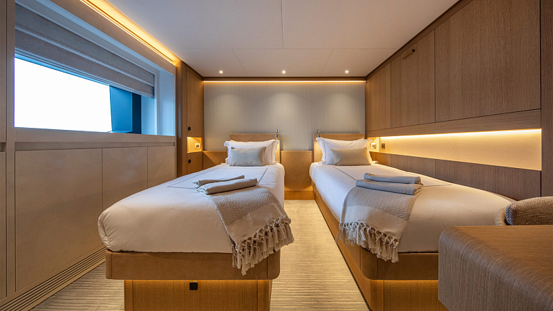 Все, начиная с ватерлинии, на этой восхитительной полностью алюминиевой трехпалубной суперяхте было спроектировано по индивидуальному заказу Гвидо де Грутом. Большое внимание уделено зонам отдыха на открытом воздухе, в том числе большой платформе для купания, которая гармонично вписывается в элегантный образ яхты. Безопасность на этой семейной яхте, рассчитанной на несколько поколений, находится на первом месте: высокие фальшборты на боковых палубах и продуманное цветовое разделение вместо открытых перил. Ритмичные линии, сложные поверхности и скульптурные элементы радуют глаз так же, как и образ жизни на борту