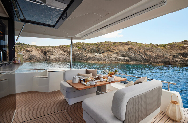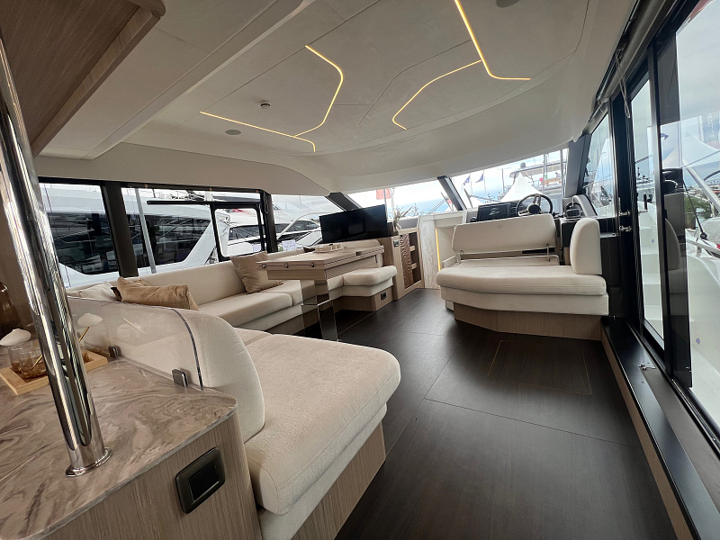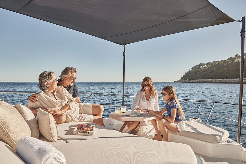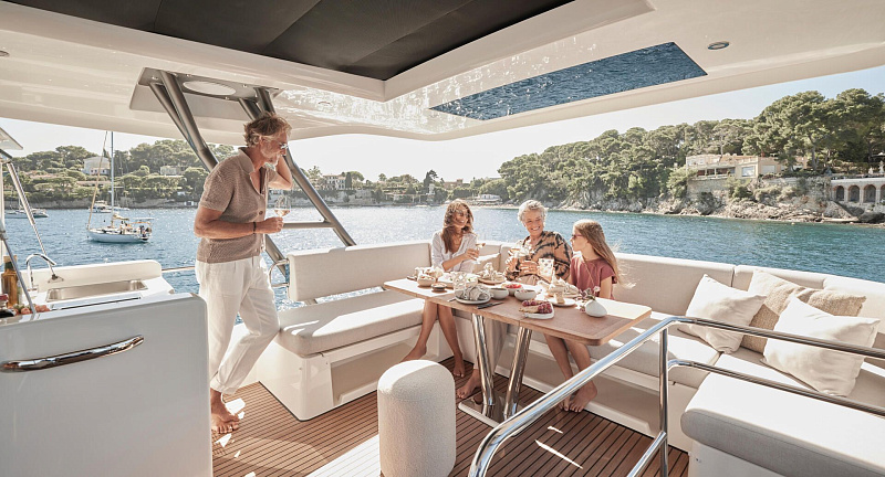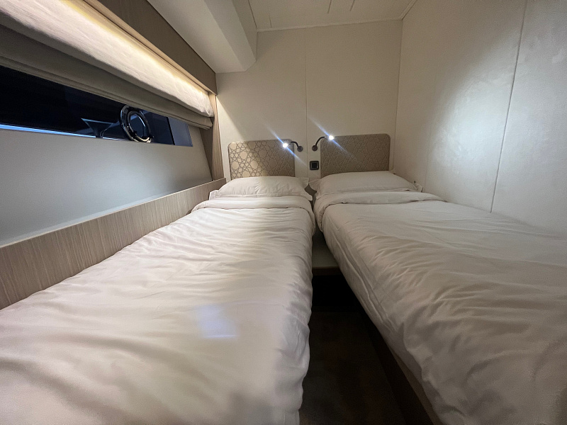 3 приватные каюты с собственными туалетными комнатами, сдвижная бортовая дверь в салоне, кухонная зона с барным окном, гидравлическая платформа, широкая лестница на флайбридж - продолжать можно долго. Лучше увидеть своими глазами!