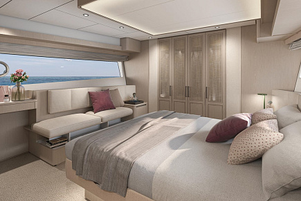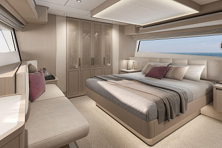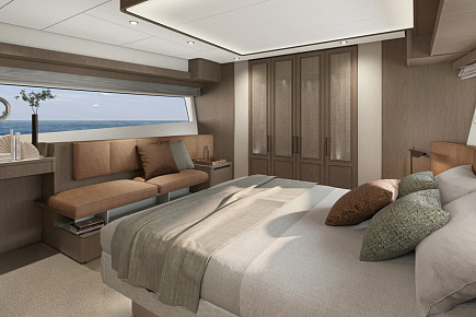 Мастер-каюта, расположенная на нижней палубе, впечатляет своими размерами и продуманной эргономикой. Кровать размещена поперёк корпуса, что позволяет наслаждаться видом из панорамных окон. Пространство дополнено вместительными системами хранения и приватной ванной комнатой.