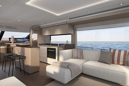 Главная палуба спроектирована как единое открытое пространство для жизни и общения. Просторная обеденная зона с диванами по обе стороны дополняется ТВ-зоной, создавая атмосферу комфорта и уюта. Камбуз может быть выполнен в двух вариантах — с островом или с дополнительной мягкой зоной отдыха. Кухонное пространство оснащено холодильником формата XXL и отделено от рулевой рубки стильным экраном с тремя дисплеями по 17 дюймов.