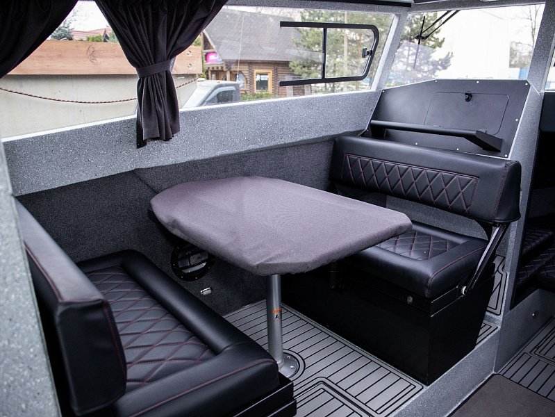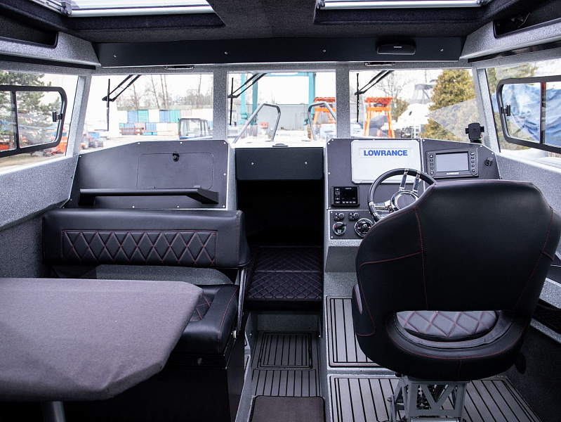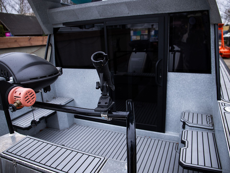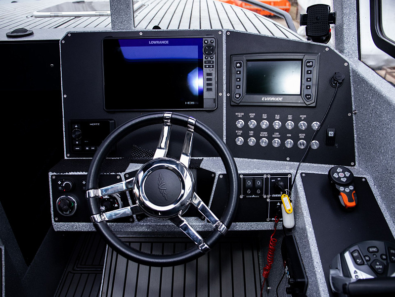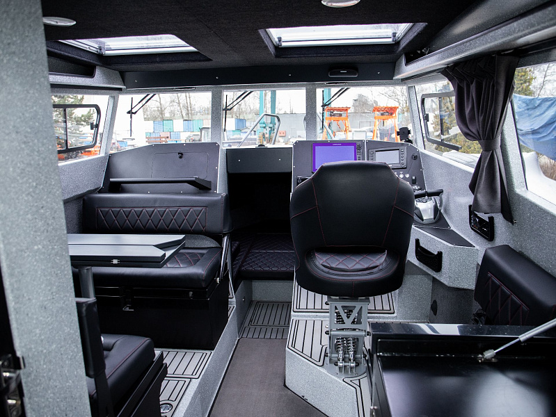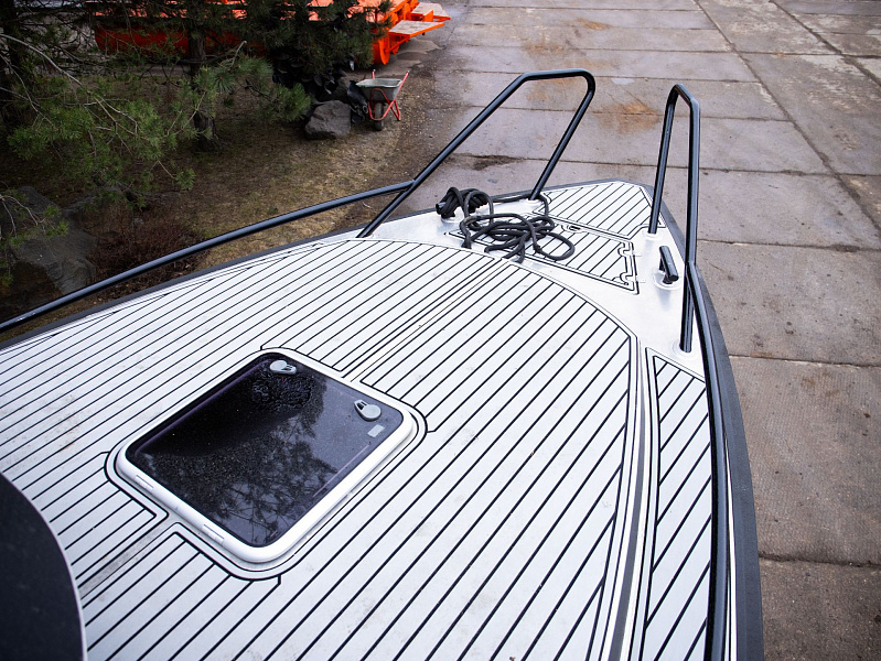Богатая стандартная комплектация включает все самое необходимое, среди них гальюн с душем, камбуз с холодильником, воздушный отопитель, носовое подруливающее устройство. Кроме того, катер доукомплектован дополнительно - современная навигация, палубное покрытие, радиостанция.