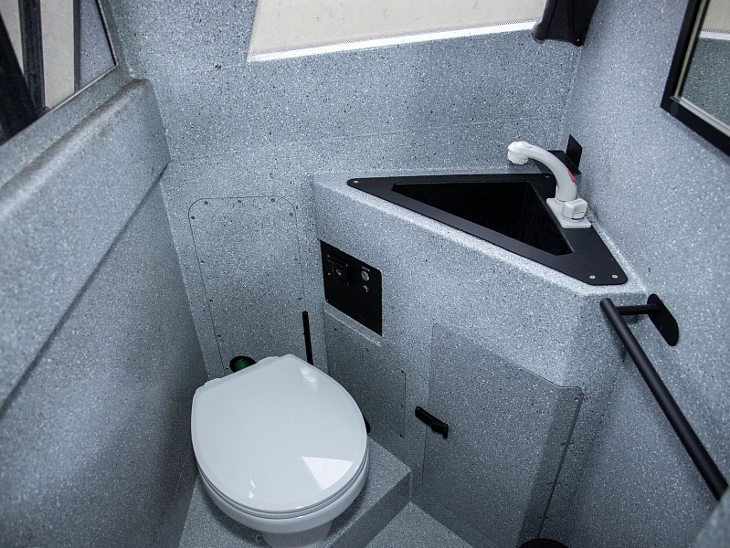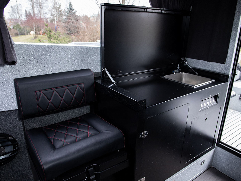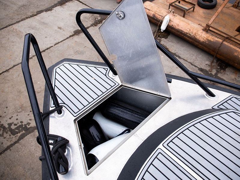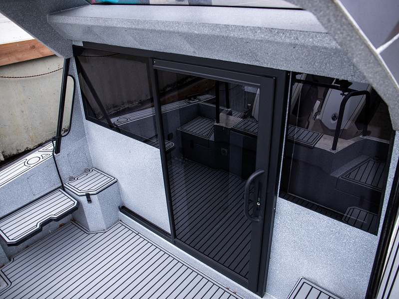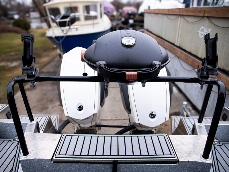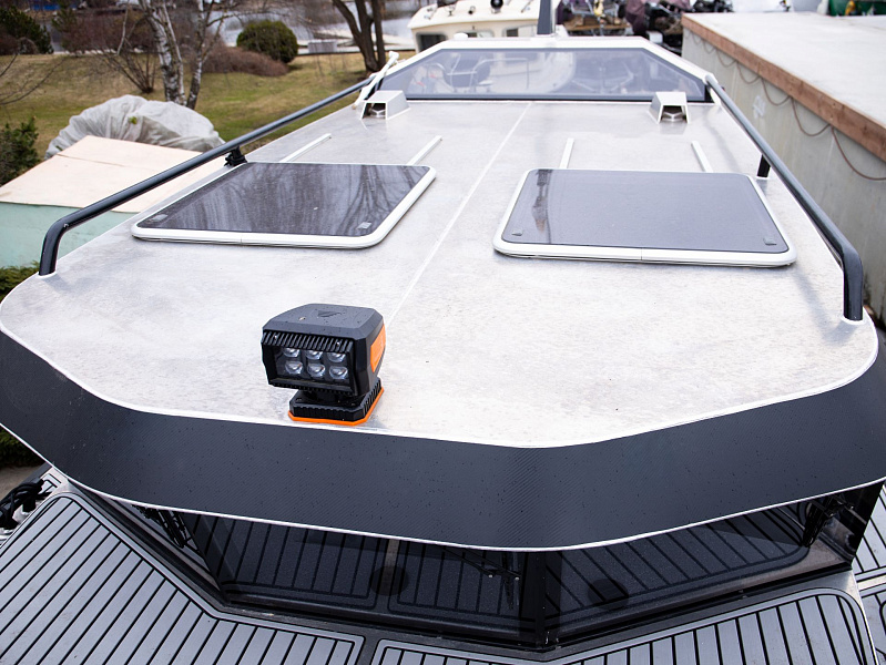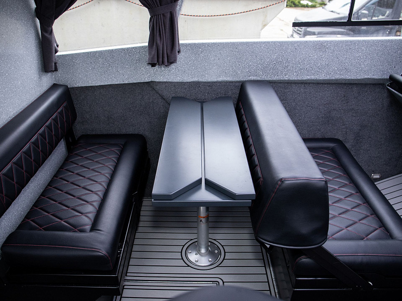 Богатая стандартная комплектация включает все самое необходимое, среди них гальюн с душем, камбуз с холодильником, воздушный отопитель, носовое подруливающее устройство. Кроме того, катер доукомплектован дополнительно - современная навигация, палубное покрытие, радиостанция.