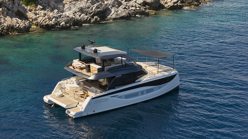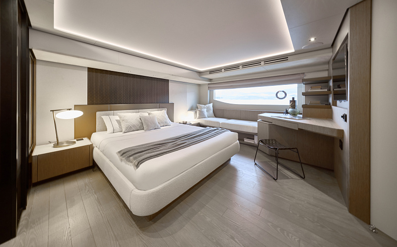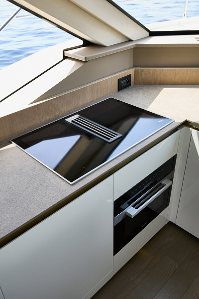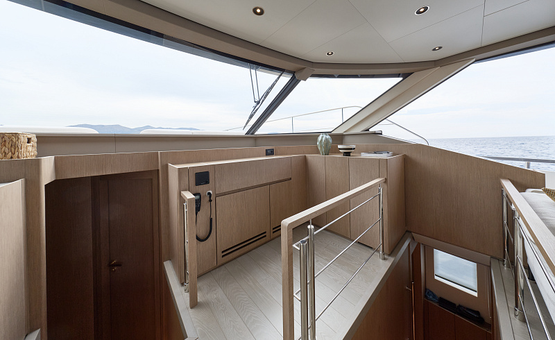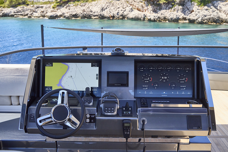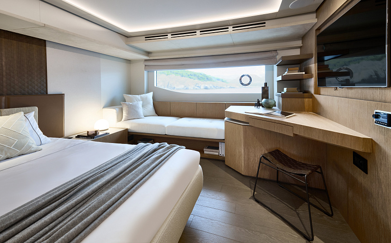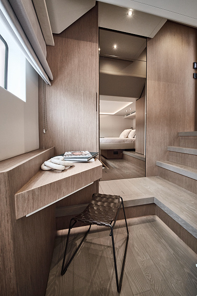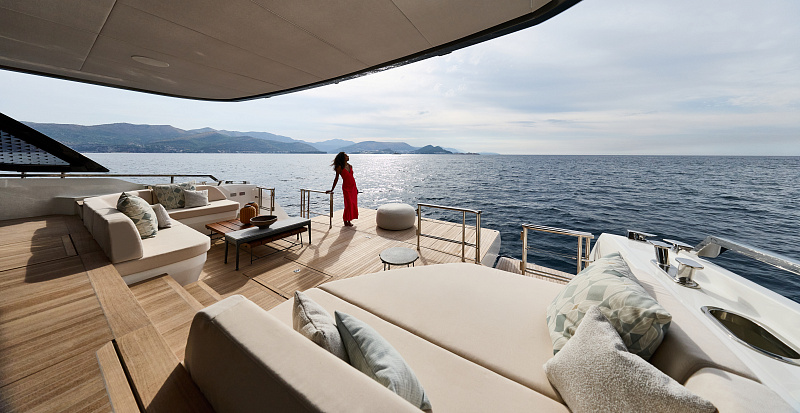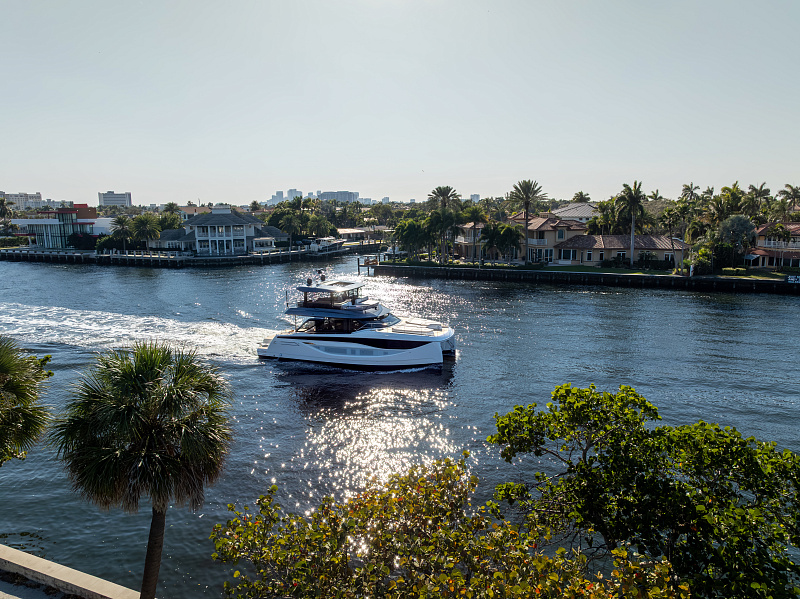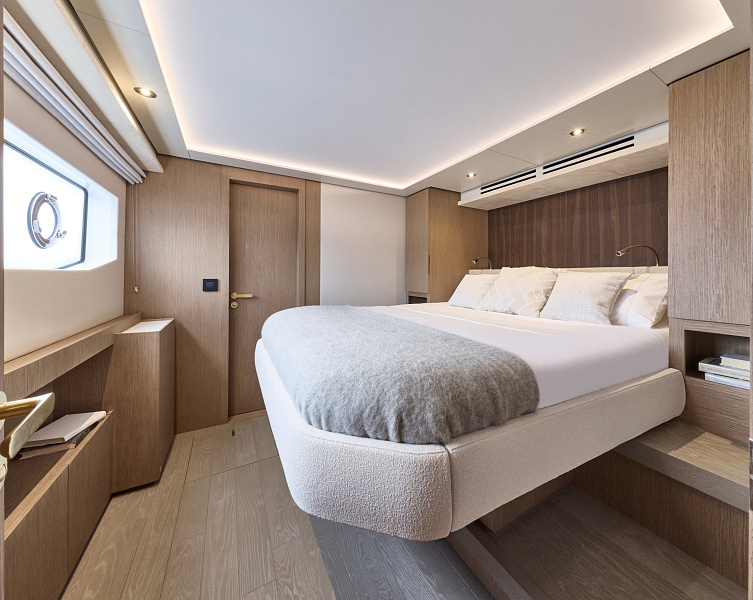 У этой лодки есть удивительная способность - казаться внутри гораздо больше, чем снаружи, благодаря уникальной архитектуре надстройки. За движение отвечают спаренные двигатели мощностью 550 л. с. каждый, что позволяет разгон до 20 узлов. При этом на крейсерских 15 узлах ход настолько плавный, что вы забываете о движении. M7 — это торжество света и воздуха: панорамные окна в пол позволяют следить за линией горизонта, не вставая с дивана в салоне. В отличие от многих конкурентов, M7 предлагает безбарьерную среду — никаких порогов и узких переходов, только открытые пространства и логичные маршруты. 150 квадратных метров жилой площади кастомизированы под требования взыскательного владельца: здесь нашлось место и для профессионального камбуза, и для лаунж-зон, которые по площади превосходят палубы