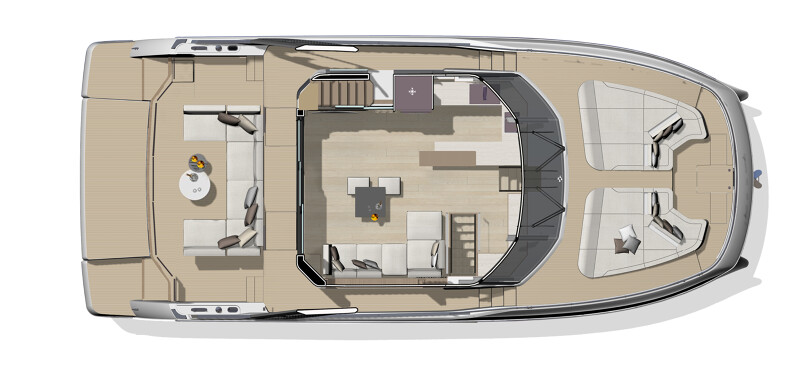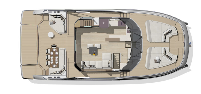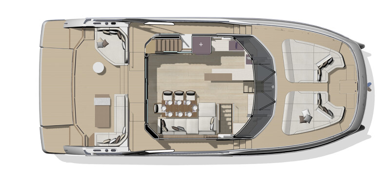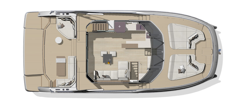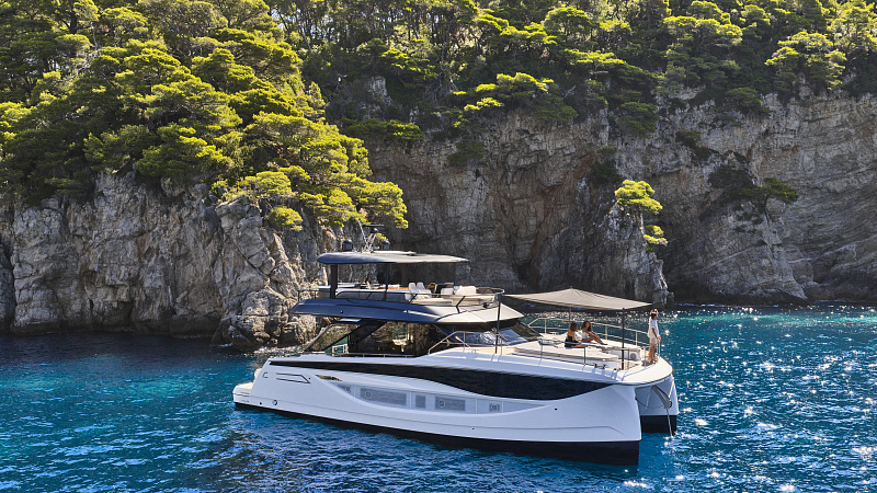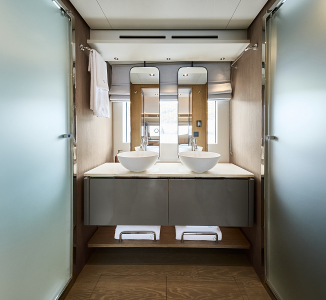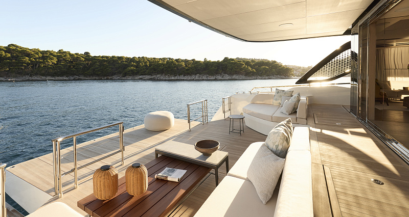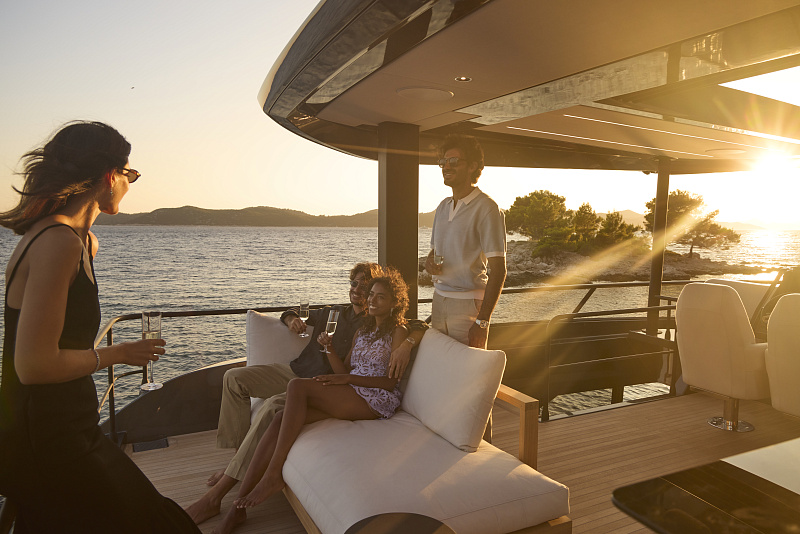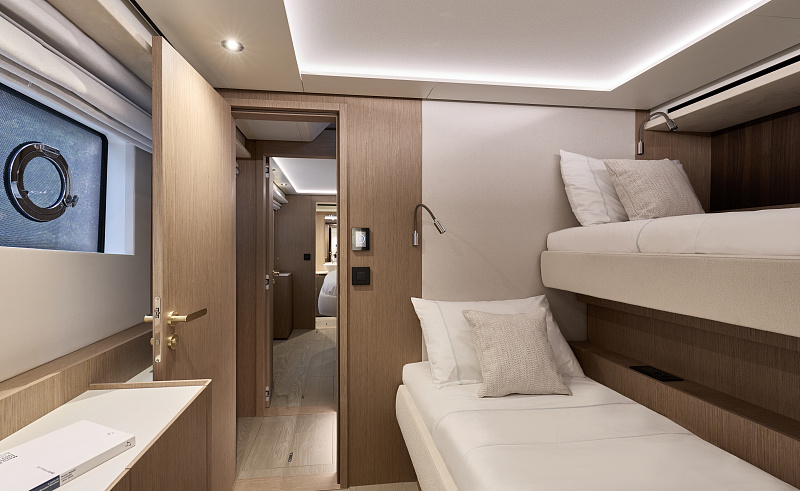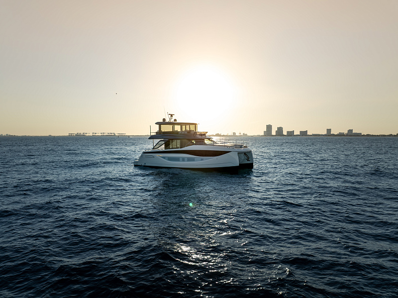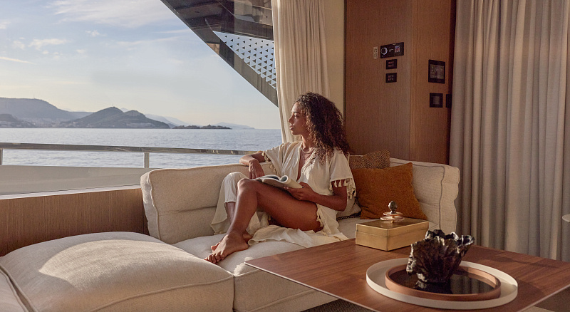 У этой лодки есть удивительная способность - казаться внутри гораздо больше, чем снаружи, благодаря уникальной архитектуре надстройки. За движение отвечают спаренные двигатели мощностью 550 л. с. каждый, что позволяет разгон до 20 узлов. При этом на крейсерских 15 узлах ход настолько плавный, что вы забываете о движении. M7 — это торжество света и воздуха: панорамные окна в пол позволяют следить за линией горизонта, не вставая с дивана в салоне. В отличие от многих конкурентов, M7 предлагает безбарьерную среду — никаких порогов и узких переходов, только открытые пространства и логичные маршруты. 150 квадратных метров жилой площади кастомизированы под требования взыскательного владельца: здесь нашлось место и для профессионального камбуза, и для лаунж-зон, которые по площади превосходят палубы