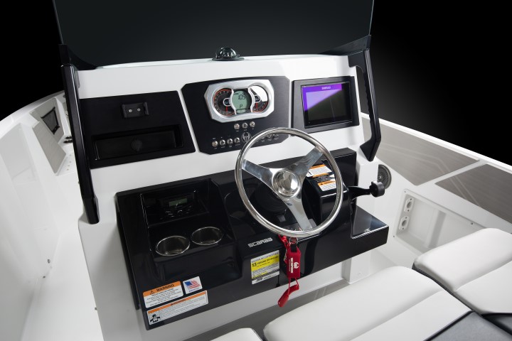 Scarab 255-водометный двухмоторный 25-футовый катер. Центральная консоль позволяет свободно перемещаться по катеру. Концепция Walk Around - идеальная для рыбалки, а также вмещает больше пассажиров.