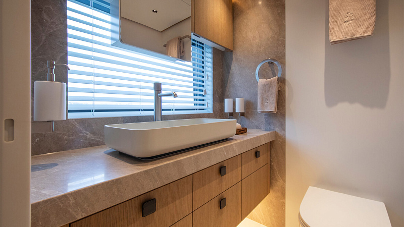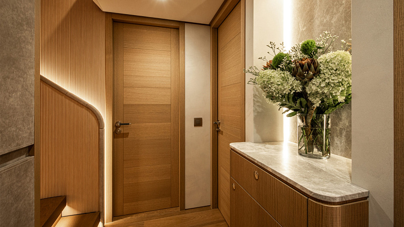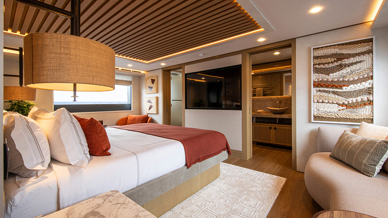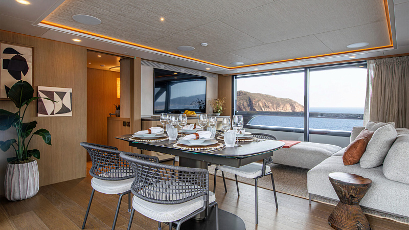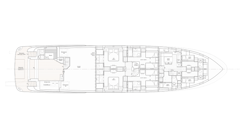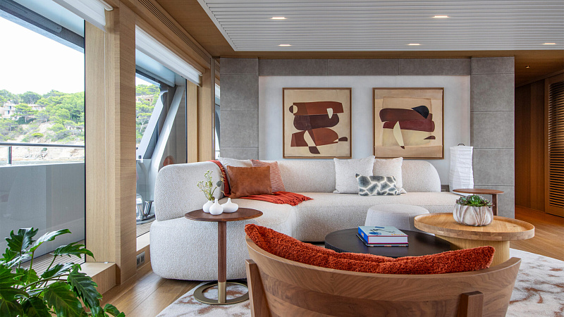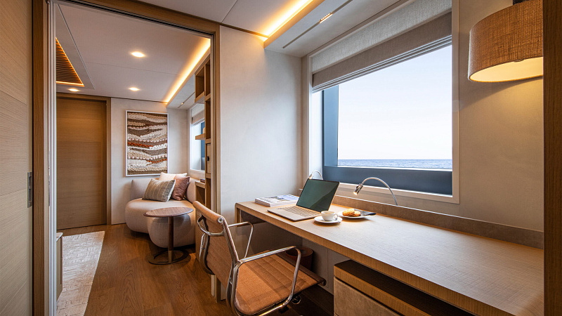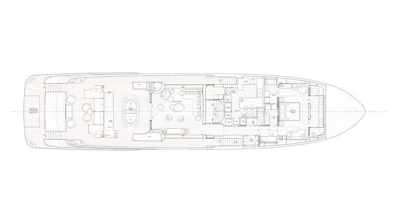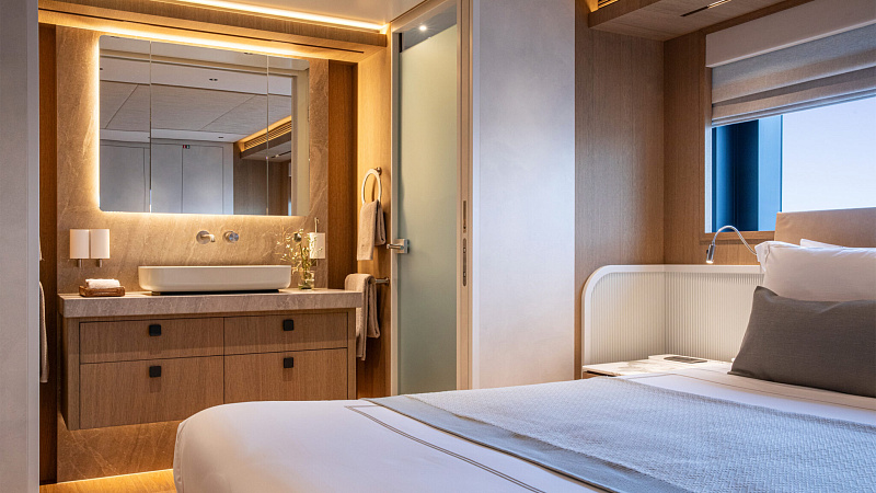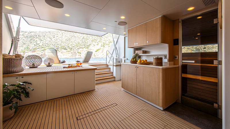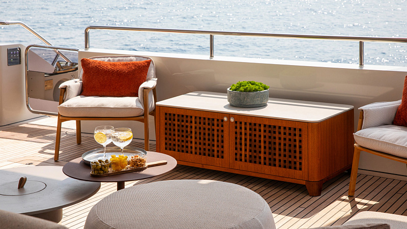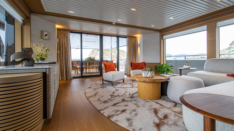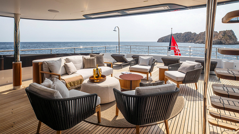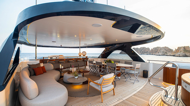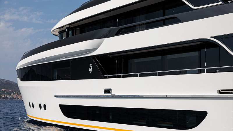Все, начиная с ватерлинии, на этой восхитительной полностью алюминиевой трехпалубной суперяхте было спроектировано по индивидуальному заказу Гвидо де Грутом. Большое внимание уделено зонам отдыха на открытом воздухе, в том числе большой платформе для купания, которая гармонично вписывается в элегантный образ яхты. Безопасность на этой семейной яхте, рассчитанной на несколько поколений, находится на первом месте: высокие фальшборты на боковых палубах и продуманное цветовое разделение вместо открытых перил. Ритмичные линии, сложные поверхности и скульптурные элементы радуют глаз так же, как и образ жизни на борту