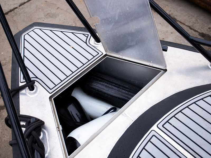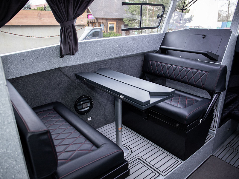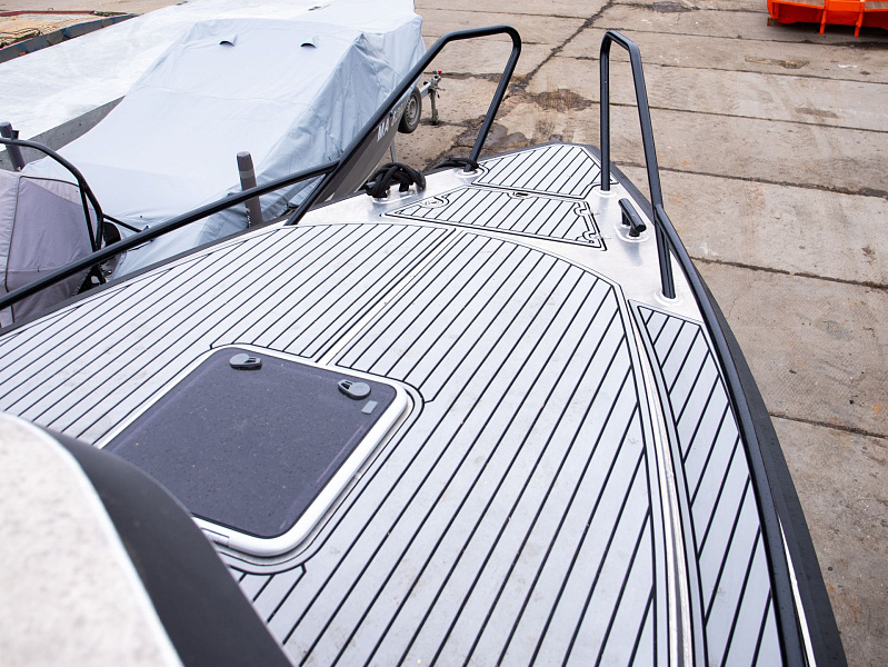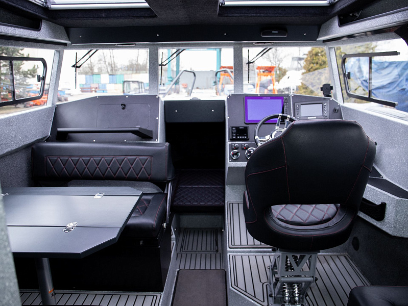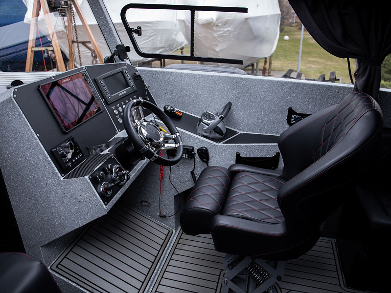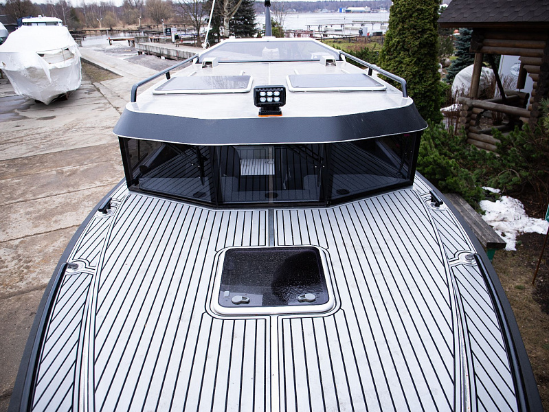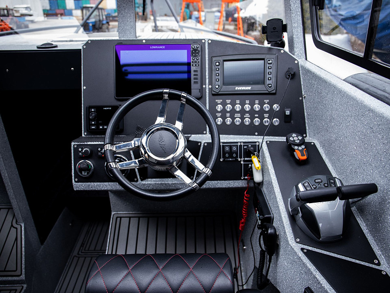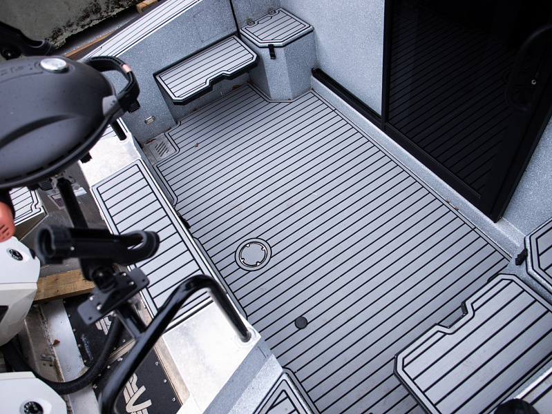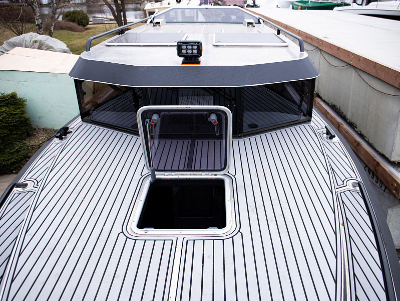 Богатая стандартная комплектация включает все самое необходимое, среди них гальюн с душем, камбуз с холодильником, воздушный отопитель, носовое подруливающее устройство. Кроме того, катер доукомплектован дополнительно - современная навигация, палубное покрытие, радиостанция.