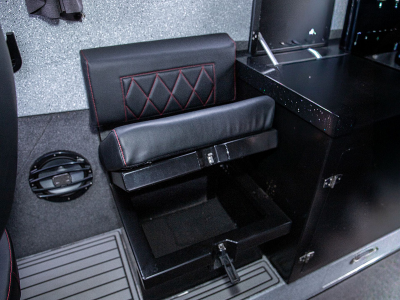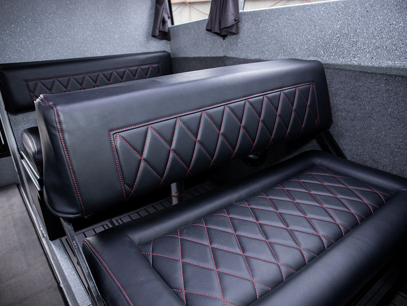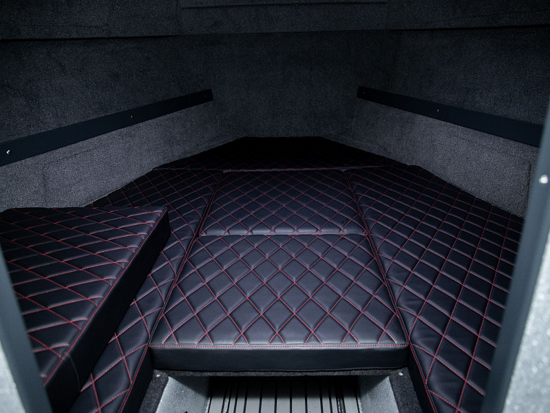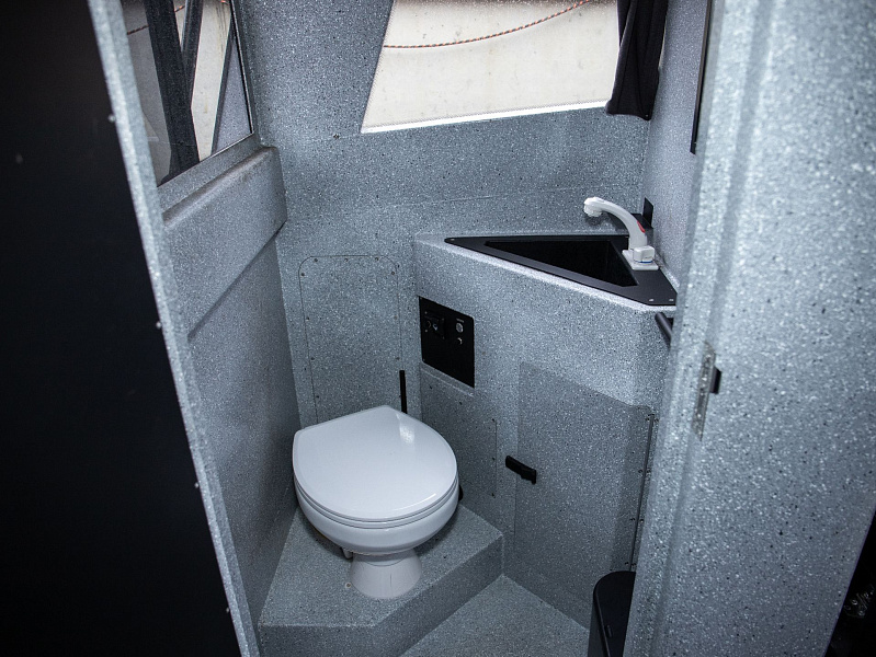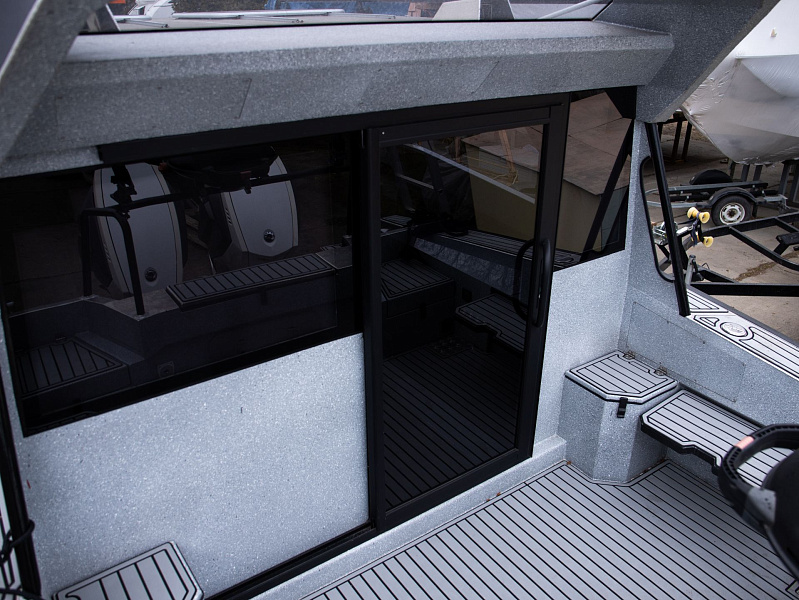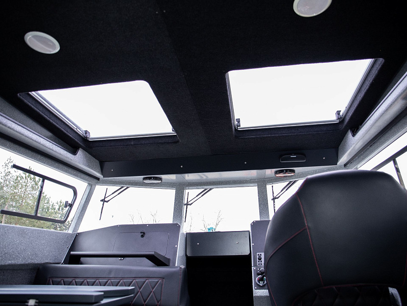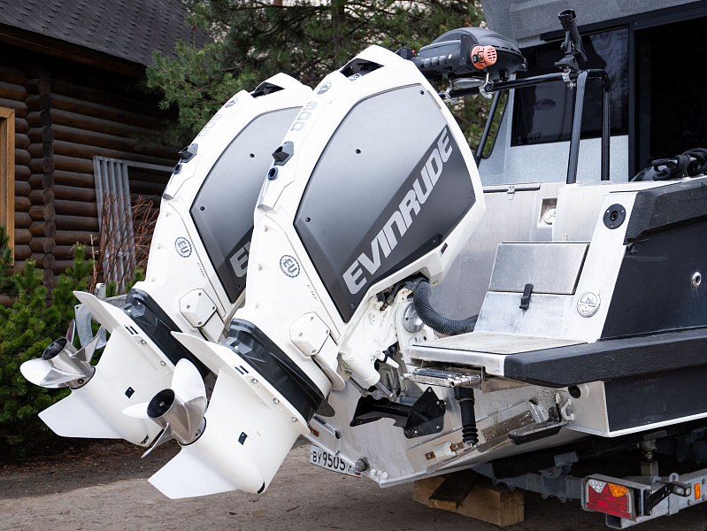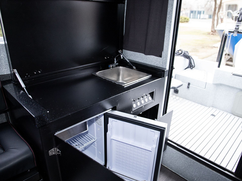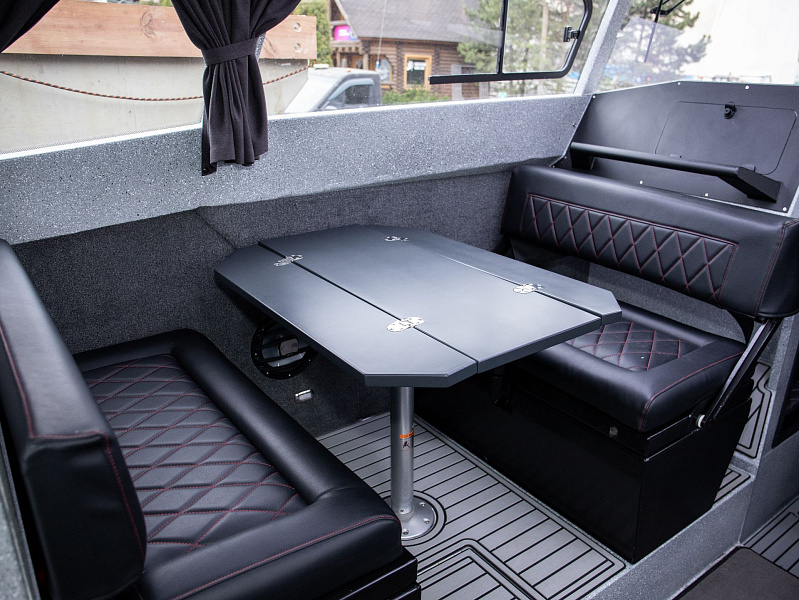 Богатая стандартная комплектация включает все самое необходимое, среди них гальюн с душем, камбуз с холодильником, воздушный отопитель, носовое подруливающее устройство. Кроме того, катер доукомплектован дополнительно - современная навигация, палубное покрытие, радиостанция.